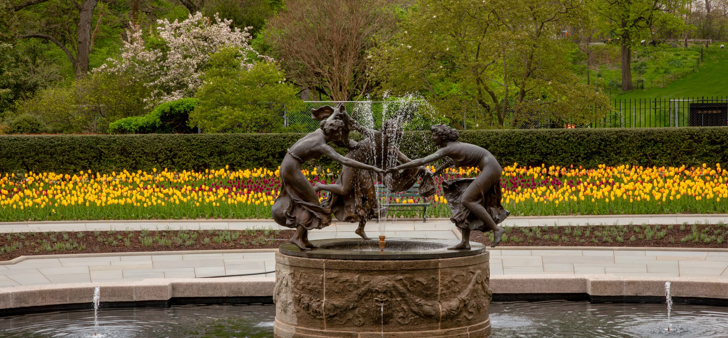In the early 1900s, the Untermyers purchased Three Dancing Maidens from the workshop of German artist Walter Schott and displayed it in the garden of their Yonkers estate. When they died, their children donated the fountain to the Park in their memory. Inspired by French garden design, the fountain was placed in the center of the northern section of the Conservatory Garden and dedicated in 1947. Standing in an oval pool and surrounded by elliptical flower beds, Three Dancing Maidens joyfully animate the garden, stretching their arms to form a circle.