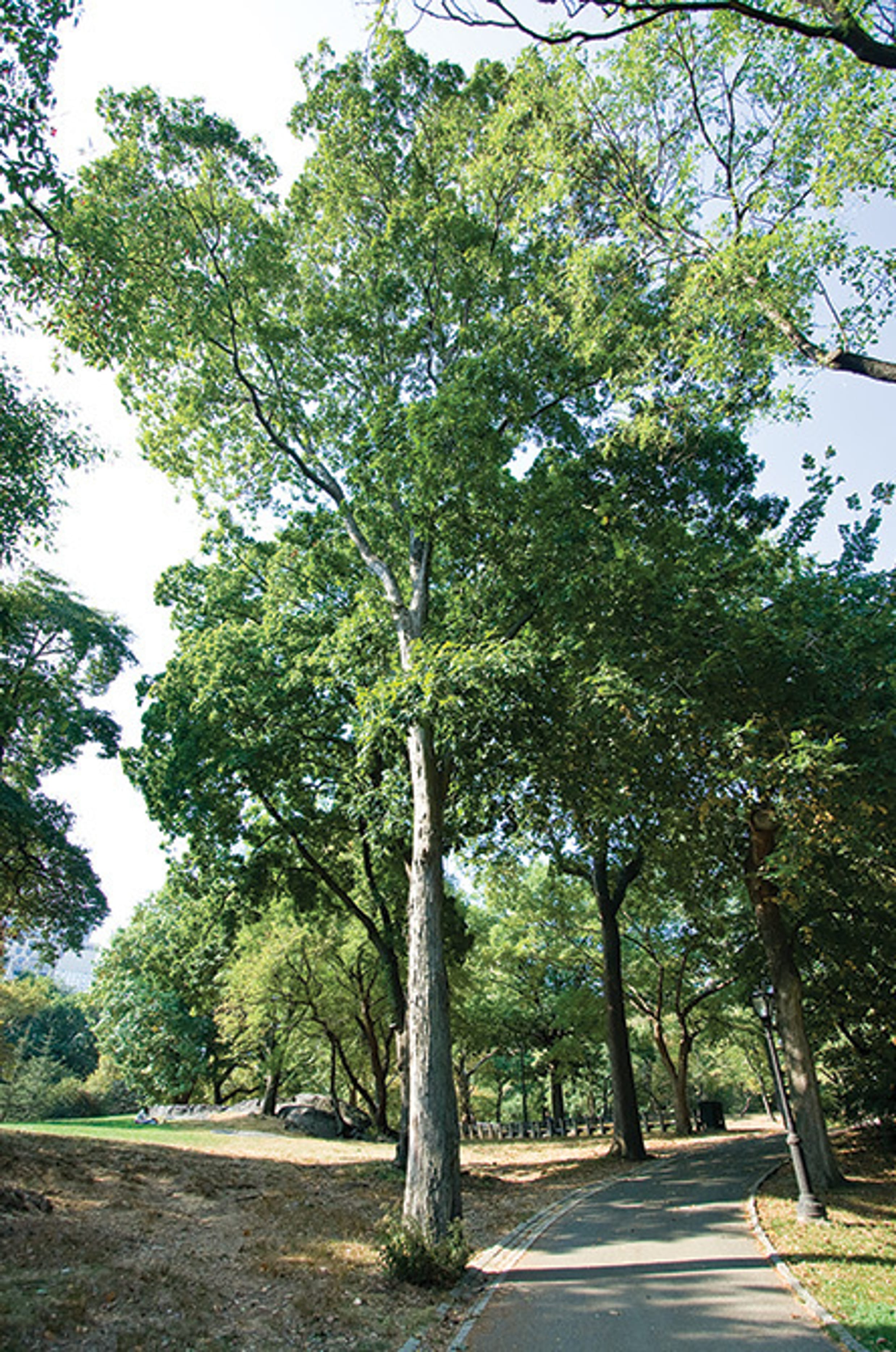 Central Park contains four hickory species, with the shagbark hickory being the most recognizable due to its gray bark that peels off in long strips. It bears nuts that are popular with squirrels and chipmunks. You can find the shagbark hickory between Wollman Rink and Driprock Arch.