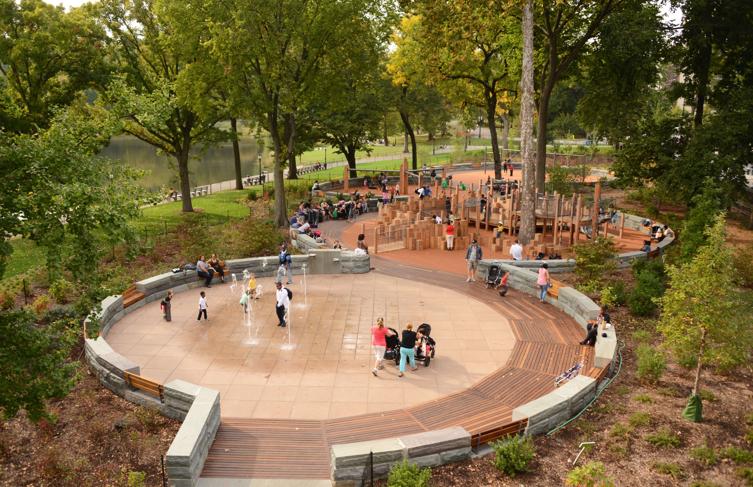 Several playground reconstructions have occurred over time at East 110th Street. The most recent project, in 2013, included the introduction of the five play areas, a composite play structure, a tire swing, a spray feature, and a nature trail. New paths, improved drainage, lawn restoration, and new plantings were also added.