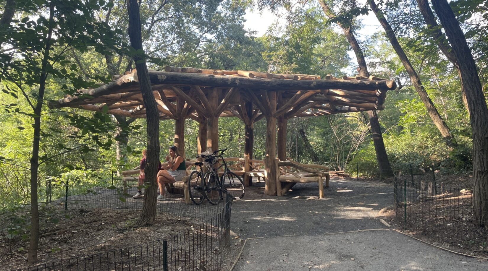 The Umbrella Structure, completed between September and November 2023, provides views of Bow Bridge and the Lake. It features a small roof canopy with a round shaded seat below and a rustic fence to frame the structure. Scope of work for this project included structural tasks such as foundations embedded into bedrock, as well as primary and secondary structural members of the structure itself; rustic wood fence installation to match the historic details; new plantings; and edging/surfacing work.